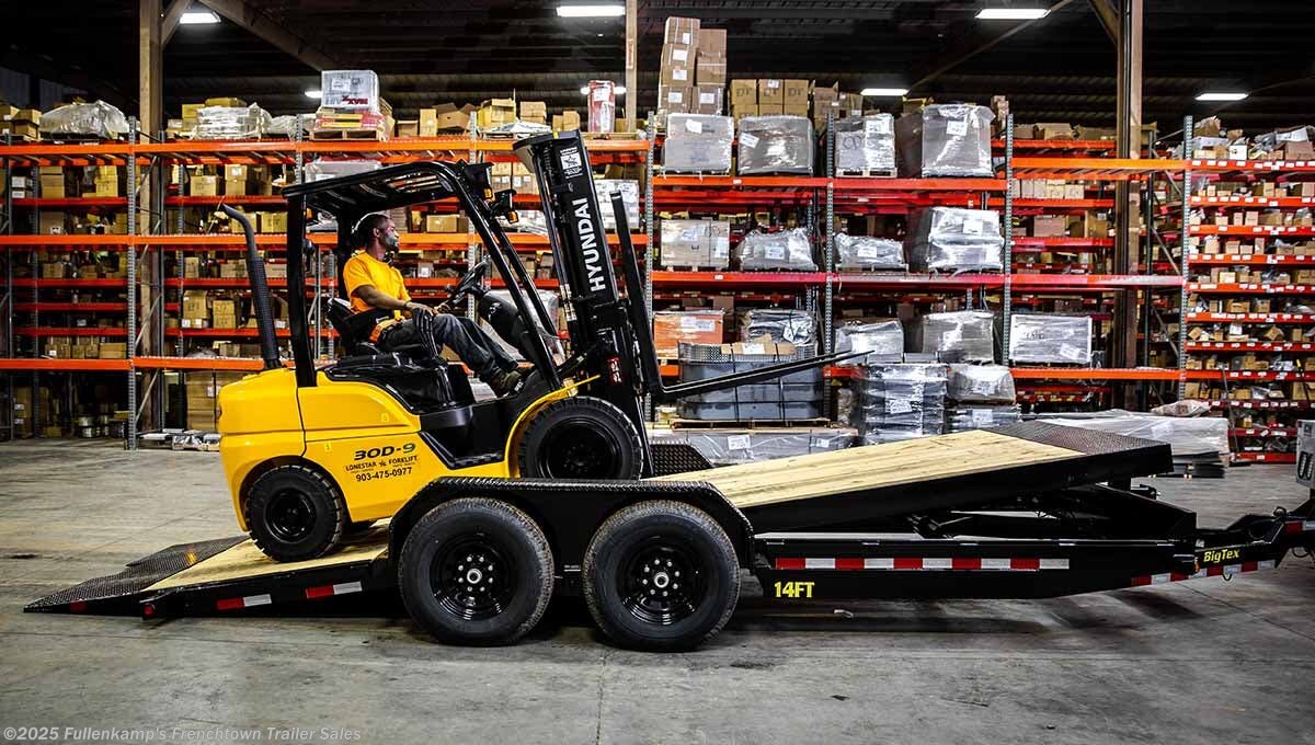 2025 BIG TEX TRAILER MFG. MODEL 14FT 20BK EQUIPMENT TRAILER, 102'' OVERALL WIDE, 83'' BETWEEN THE FENDERS X 20' OF TILTING DECK W/ A CUSHION CYLINDER & STAKE POCKETS ALONG SIDES, W/ 6 D-RINGS FOR TIE DOWNS, 6'' CHANNEL MAIN FRAME, 3'' CHANNEL & 3'' TUBE CROSSMEMBERS, 9'' X 72'' 14 GA DIAMOND STEEL PLATE REMOVEABLE FENDERS, 12K DROPLEG JACK, ADJUSTABLE 2 5/16" COUPLER W/ SAFETY CHAINS, TREATED FLOORING, ST-235/80R X 16'' (3520#) LOAD RANGE "E" RADIAL TIRES, 8 - BOLT MOD WHEELS, (2) 7,000#, 4" DROP EZ LUBE W/ ELECTRIC BRAKES, MULTI-LEAF SLIPPER SPRING W/ EQUALIZER SUSPENSION, DOT LEGAL, RV PLUG, LED LIGHTS, W/ SEALED HARNESS, BLACK IN COLOR, 14000# GVWR, APPROX 3490# SHIPPING WEIGHT, SN: 16V1C2520S2384214